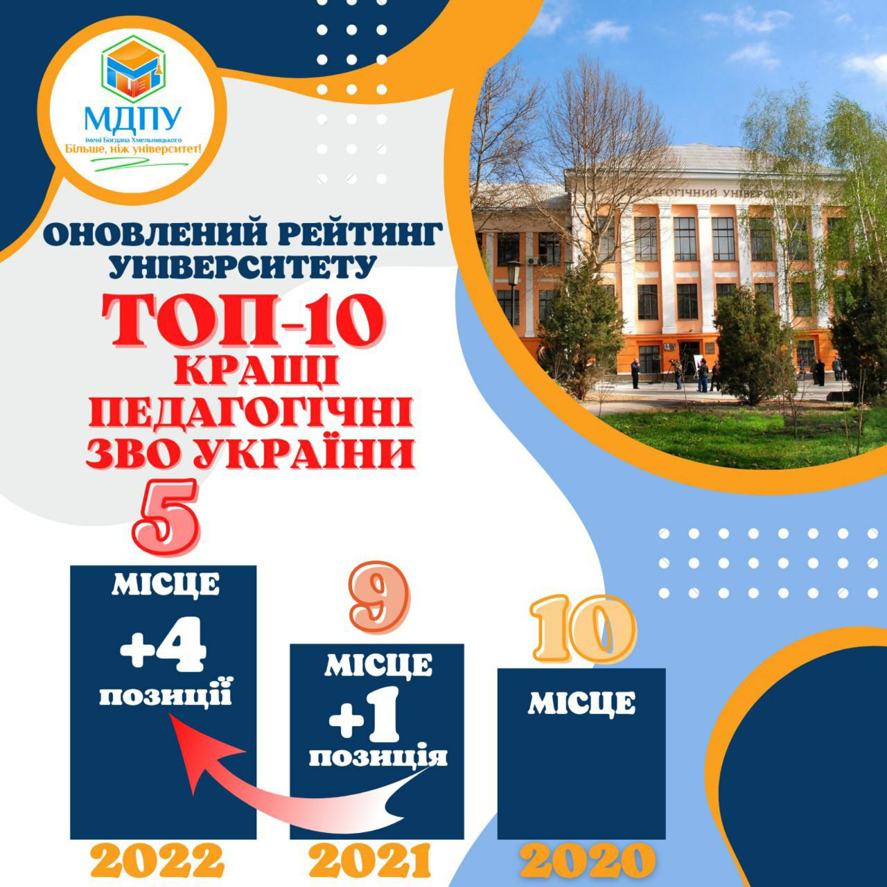 Мелітопольський державний педагогічний університет імені Богдана Хмельницького серед педагогічних закладів вищої освіти України у 2022 році посідає 5 сходинку, у порівнянні з 2021 роком ми були 9, а в 2020 році займали 141 місце у даному рейтингу.