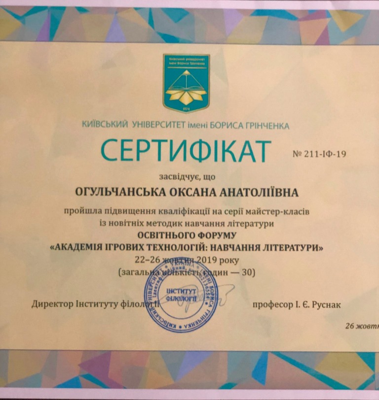 26 жовтня Огульчанська Оксана Анатоліївна, кандидат філологічних наук, старший викладач кафедри української і зарубіжної літератури взяла участь в освітньому форумі «Академія ігрових технологій: навчання літератури» (Київський університет імені Бориса Грінченка).