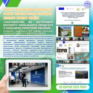 🌍💻 28 квітня 2025 року науково-педагогічні працівники кафедри економіки, готельно-ресторанного та туристичного бізнесу взяли активну участь у підсумковій конференції ✅⚙️«Партнерство як інструмент експорту локального продукту з сільських територій України».