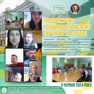 6 червня 2024 року підписано Договір про співпрацю між Мелітопольським державним педагогічним університетом імені Богдана Хмельницького в особі ректорки, доцента Наталі ФАЛЬКО та Полтавським національним педагогічним університетом імені В. Г. Короленка в особі ректорки Марини ГРИНЬОВОЇ!