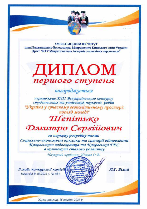 📚🌊У рамках конференції «Україна у сучасному геополітичному просторі: погляд молоді» Дмитро презентував свою роботу на тему «Соціально-економічні виклики та сценарії відновлення Каховського водосховища та Каховської ГЕС в контексті сталого розвитку» в секції «Соціально-економічні перспективи розвитку України у ХХІ ст.».
