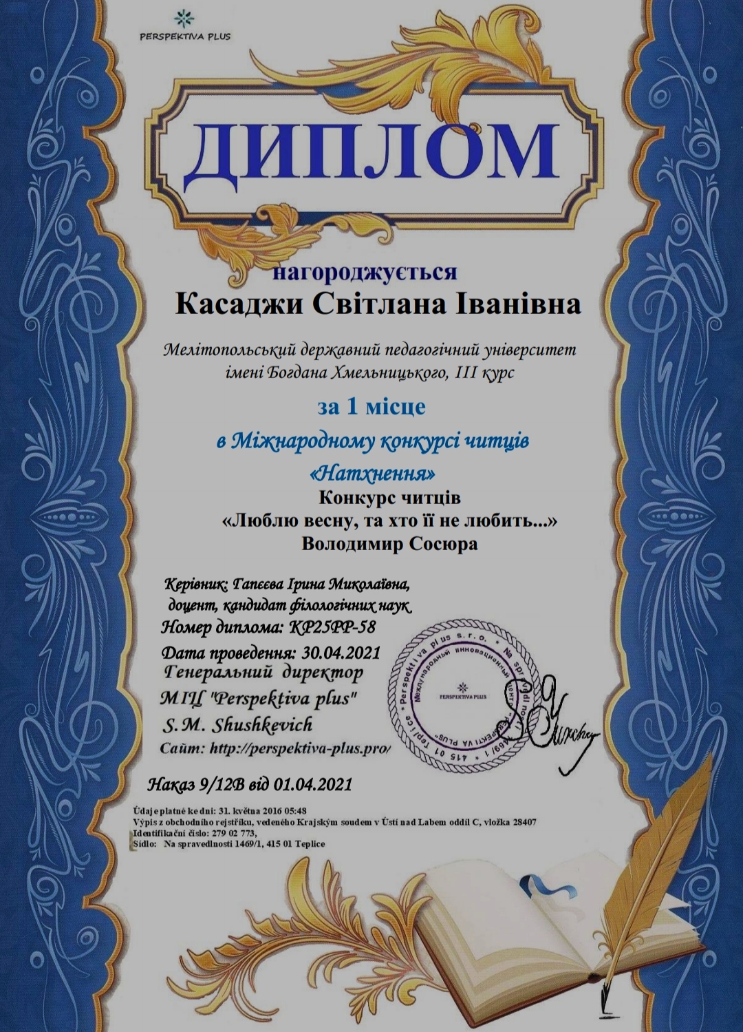 Наприкінці засідання відбулося нагородження студентів за активну участь у роботі гуртка та різноманітних мовних конкурсах. Так, студентка 318-ф групи КАСАДЖИ СВІТЛАНА посіла І місце у Міжнародному конкурсі читців «Натхнення» (Чехія, 01.04.2021), на якому представила поезію Володимира Сосюри «Люблю весну, та хто її не любить…».