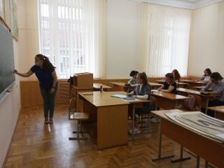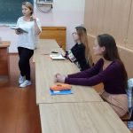 На фото: заняття проводить асистент кафедри методики викладання германських мов Гостіщева Наталя Олексіївна. В університеті Наталія Олексіівна викладає навчальні курси «Основна іноземна мова» і «Практичний курс англійської мови» для студентів спеціальності «германські мови і література», а також «мова і література (англійська, німецька)». Стаж педагогічної роботи у вищих навчальних закладах IV рівня акредитації – 27 років.