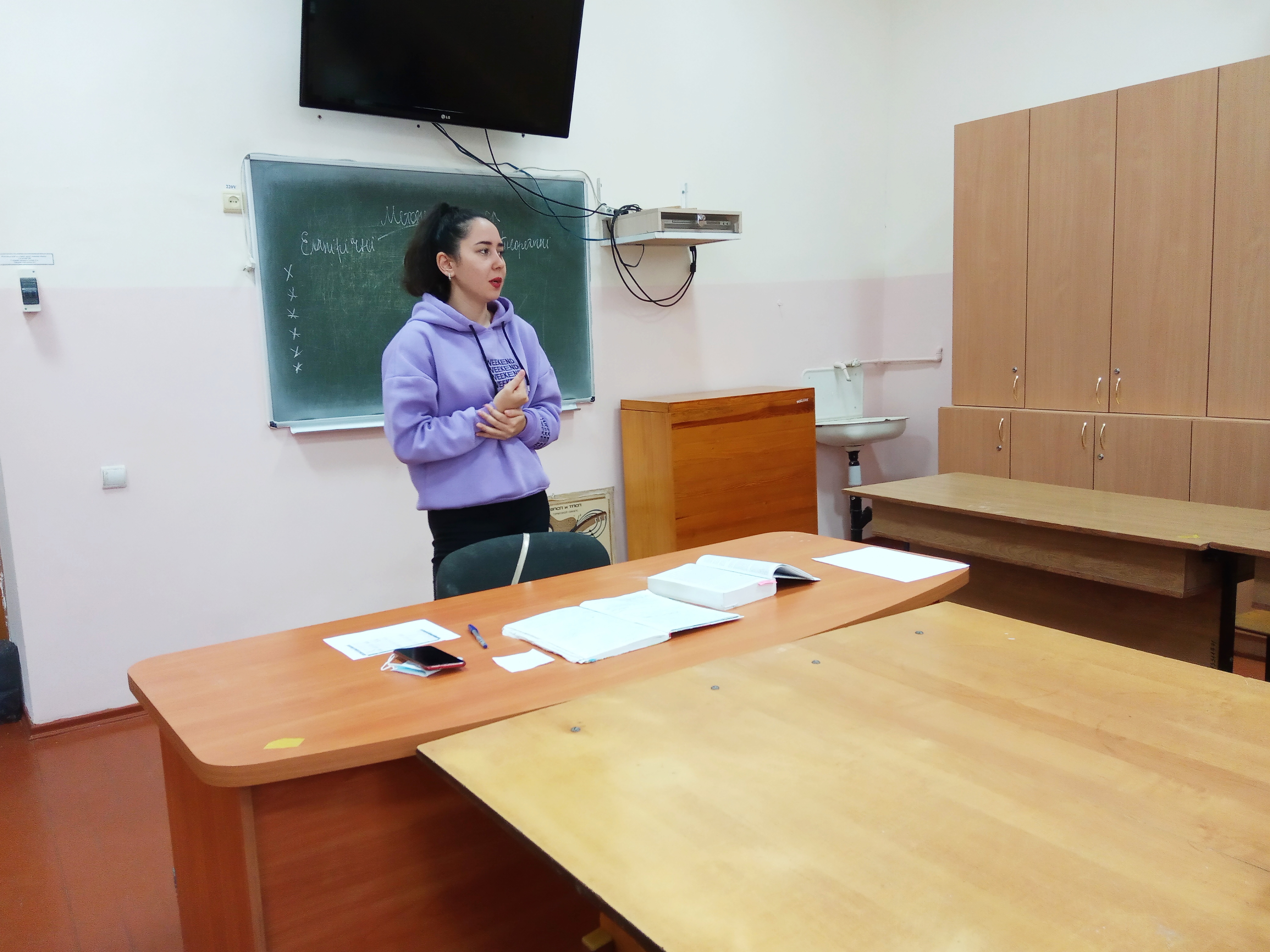 На фото: навчальне заняття проводить аспірант кафедри екології, загальної біології та раціонального природокористування МДПУ імені Богдана Хмельницького Умерова Ава Кадріївна. Має диплом магістра з відзнакою. Переможниця конкурсу «Вчитель-професіонал». Стаж педагогічної роботи на підготовчому відділенні – 3 роки. Наукові інтереси: вплив екологічних факторів на формування міських ландшафтів, моніторинг навколишнього середовища.