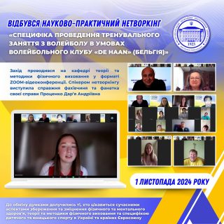🎓🇺🇦1 листопада 2024 року кафедра теорії та методики фізичного виховання провела науково-практичний нетворкінг «Специфіка проведення тренувального заняття з волейболу в умовах волейбольного клубу «De Haan» (Бельгія)» у форматі ZOOM-відеоконференції.