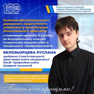 Колектив Мелітопольського державного педагогічного університету імені Богдана Хмельницького щиро вітає здобувача ІІ(магістерського) рівня вищої освіти спеціальності 015.39 Професійна освіта (Цифрові технології)