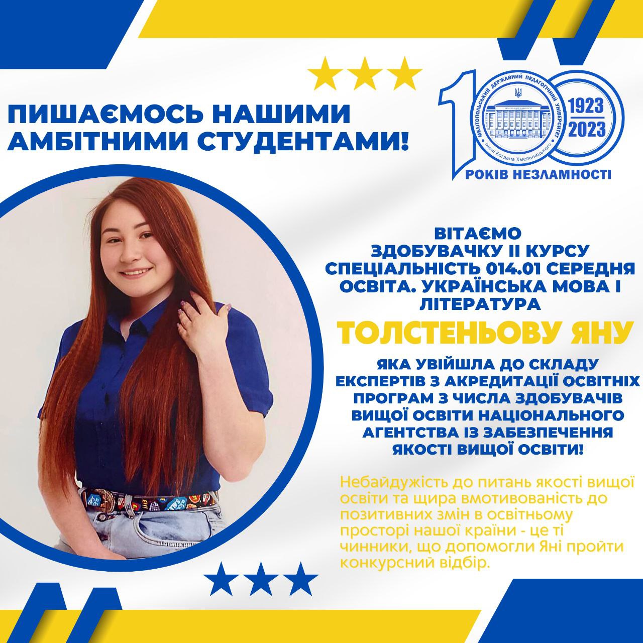 Колектив Мелітопольського державного педагогічного університету імені Богдана Хмельницького вітає студентку другого курсу (спеціальність 014.01 Середня освіта. Українська мова і література) Толстеньову Яну Сергіївну, яка увійшла до складу експертів з акредитації освітніх програм з числа здобувачів вищої освіти Національного агентства із забезпечення якості вищої освіти!