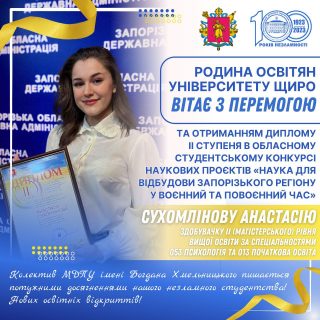Колектив Мелітопольського державного педагогічного університету імені Богдана Хмельницького щиро вітає з отриманням диплому II ступеня здобувачку ІІ (магістерського) рівня вищої освіти за спеціальностями 053 Психологія та 013 Початкова освіта СУХОМЛІНОВУ АНАСТАСІЮ!