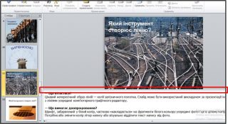 У презентації «Презентація VS Презентація» надано практичні рекомендації щодо створення електронних слайдів, які викладачі зможуть використати за проектування власних електронних слайдів і згодом застосувати на навчальних заняттях. Презентація містить слайди із порівняльними візуальними рядами і докладними коментарями до кожного з цих слайдів. Для того, щоби побачити коментар, треба завантажити файл із презентацією, відкрити її, переконатися, що Ви перебуваєте у режимі перегляду «Обычный» і відбуксувати нижню границю робочої зони (на малюнку вона позначена червоною рамкою) угору на довільну висоту. Відповідно область зі слайдом скоротиться, але Ви зможете вільно переглядати коментарі до слайду. Коментарі до кожного зі слайдів створювалися за принципом: «Актуальне питання — Відповідь практика».