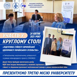 ⭐️🇪🇺 24 квітня 2025 року проректор з науково-педагогічної роботи, зовнішніх зв’язків і стратегічного розвитку Олена Арабаджи взяла участь у круглому столі «Підготовка стійкості європейської ідентичності українського суспільства», що відбувся в Запорізькому національному університеті в рамках міжнародного проєкту ERASMUS.
