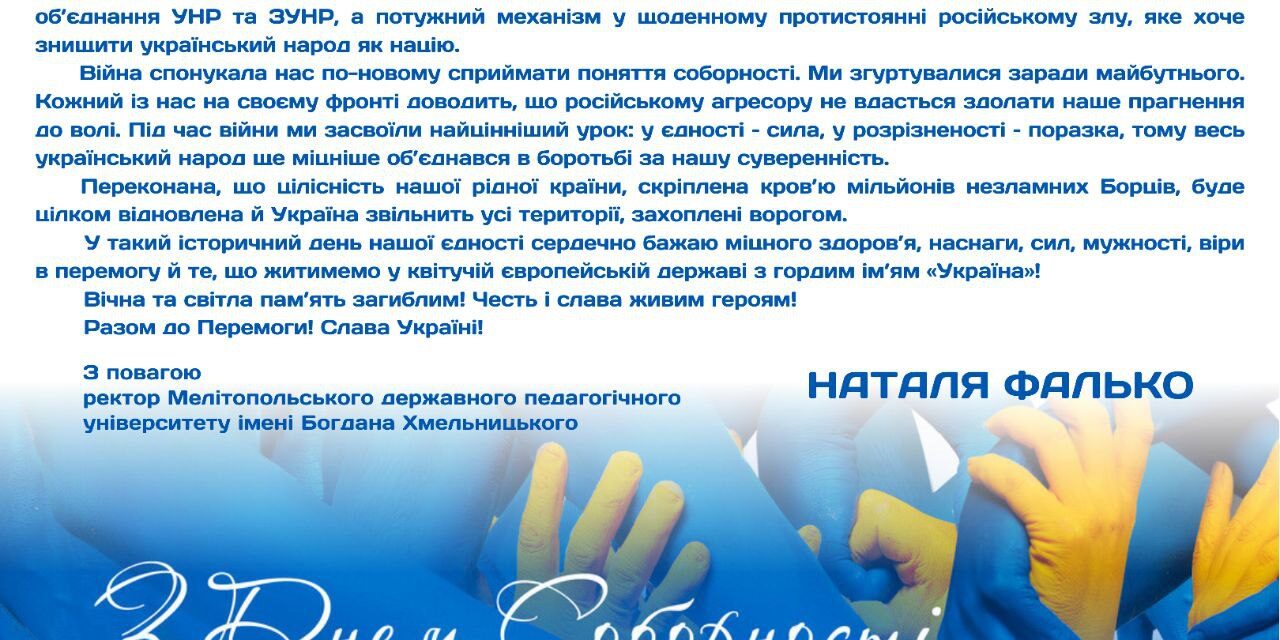 Привітання ректора Мелітопольського державного педагогічного університету імені Богдана Хмельницького, кандидата психологічних наук, доцента Фалько Наталі Миколаївни з Днем Соборності України!