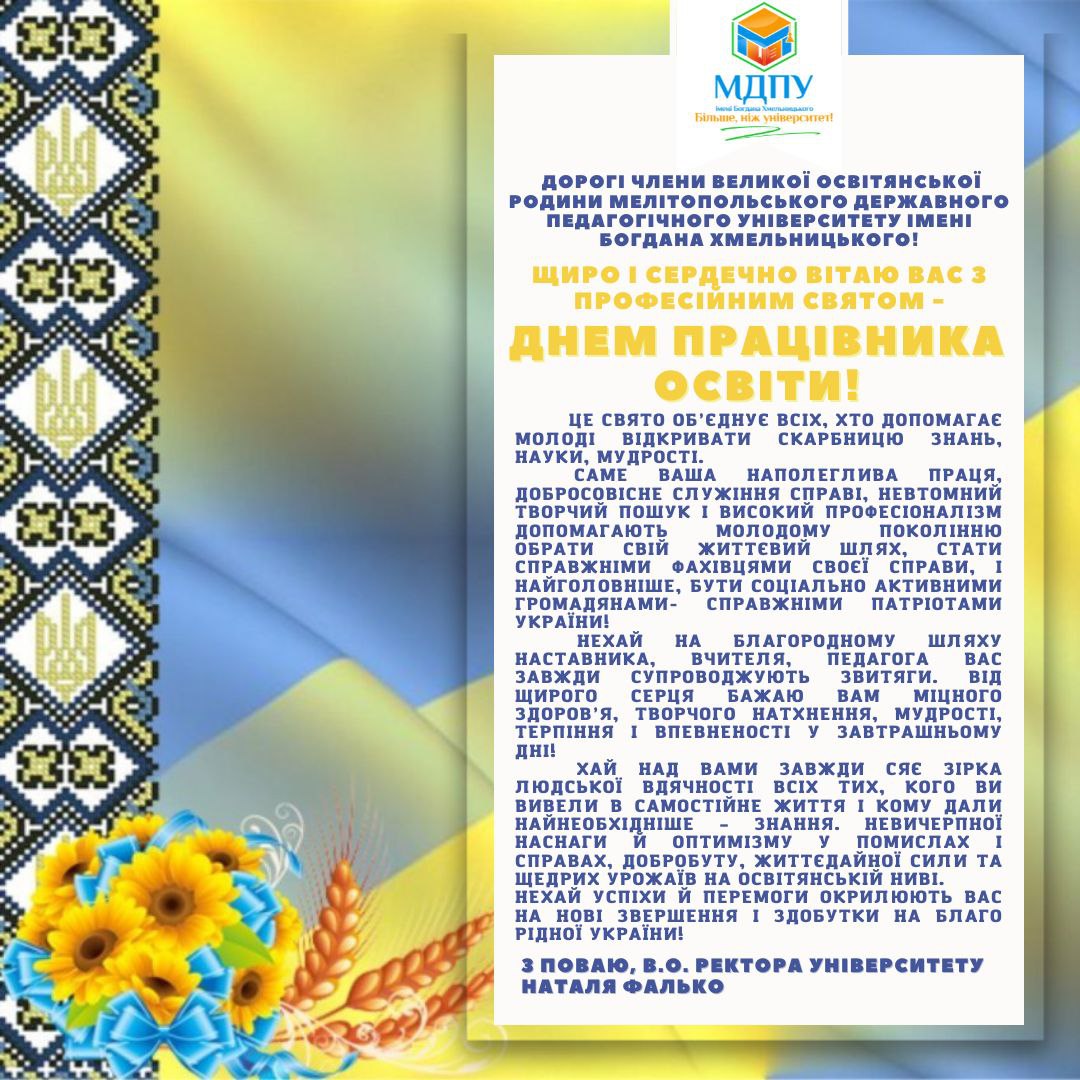 Жов22022Новини університету Post Views: 93 Category: Новини університетуВід mdpu_supervisor02.10.2022 Author: mdpu_supervisor Post navigationПопереднійПопередній пост:Запрошуємо всіх на святковий ефір привітань ДО ДНЯ ПРАЦІВНИКА ОСВІТИ УКРАЇНИ!NextNext post:НАШ УНІВЕРСИТЕТ – ВАШ ПРІОРИТЕТ!Related PostsМІЖНАРОДНИЙ ДЕНЬ ЗАПОБІГАННЯ ЕКСПЛУАТАЦІЇ НАВКОЛИШНЬОГО СЕРЕДОВИЩА ПІД ЧАС ВОЄННИХ І ЗБРОЙНИХ КОНФЛІКТІВ06.11.2025УСПІШНИЙ СТАРТ В АСПІРАНТУРІ: РЕКОМЕНДАЦІЇ ЩОДО СКЛАДАННЯ ІНДИВІДУАЛЬНОГО ПЛАНУ06.11.2025МРІЙ. ДІЙ. ПЕРЕМАГАЙ РАЗОМ З МДПУ!06.11.2025ЗАПРОШУЄМО ВЗЯТИ УЧАСТЬ У РОБОТІ КОНФЕРЕНЦІЇ!06.11.2025ВОРКШОП “ІДЕЇ ДЛЯ УРОКІВ МАЙБУТНЬОГО” — ОСВІТНІЙ ПРОСТІР ІННОВАЦІЙ ТА ПРОФЕСІЙНОГО ЗРОСТАННЯ!05.11.2025ВІТАЄМО З ПЕРЕМОГОЮ!05.11.2025