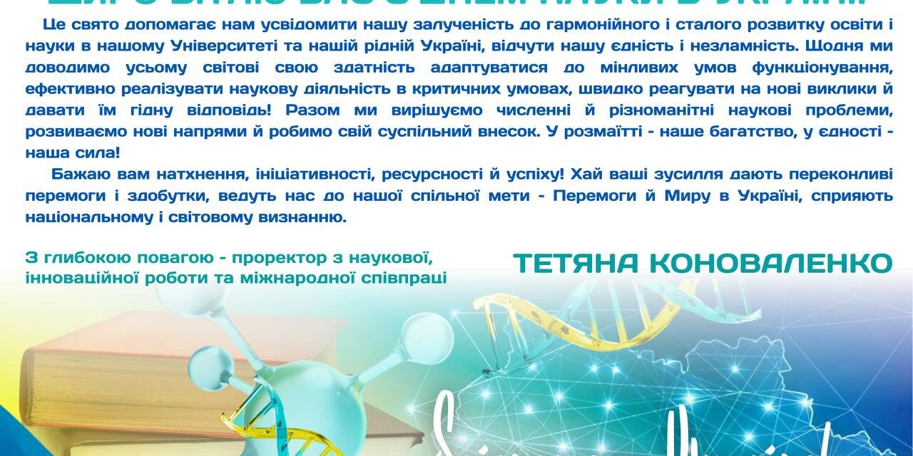 Привітання з Днем науки в Україні проректора з наукової, інноваційної роботи та міжнародної співпраці Мелітопольського державного педагогічного університету імені Богдана Хмельницького Тетяни Коноваленко