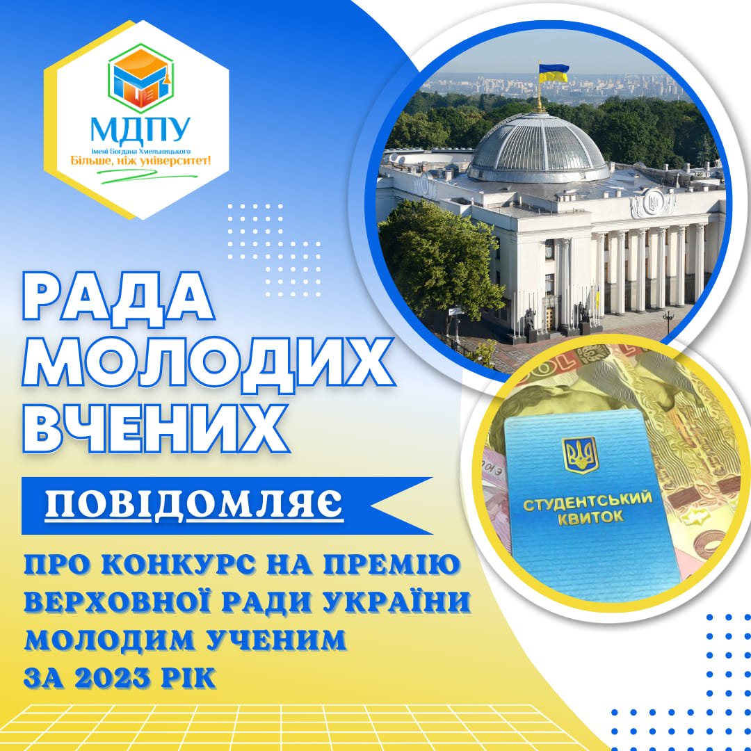 Комітет Верховної Ради України з питань освіти, науки та інновацій інформує, що відповідно до Положення про Премію Верховної Ради України молодим ученим, затвердженого Постановою Верховної Ради України від 05.02.2019 № 2675-VIII “Про Премію Верховної Ради України молодим ученим”, розпочався етап формування, висунення та подання робіт на Премію Верховної Ради України молодим ученим за 2023 рік.Відповідно до пункту 2 Положення Комітет Верховної Ради України з питань освіти, науки та інновацій своїм Рішенням від 15.12.2021 (протокол № 90) затвердив Інструкцію з оформлення і подання документів на присудження Премії Верховної Ради України молодим ученим та порядку їх розгляду.