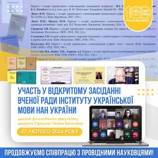 27 лютого 2024 року декан філологічного факультету, доцент Сіроштан Тетяна Василівна відвідала відкрите засідання Вченої ради Інституту української мови НАН України, де взяла участь в обговоренні доповіді Руслани Коци “Українська історична дериватологія в контексті славістики: проблеми і перспективи”.