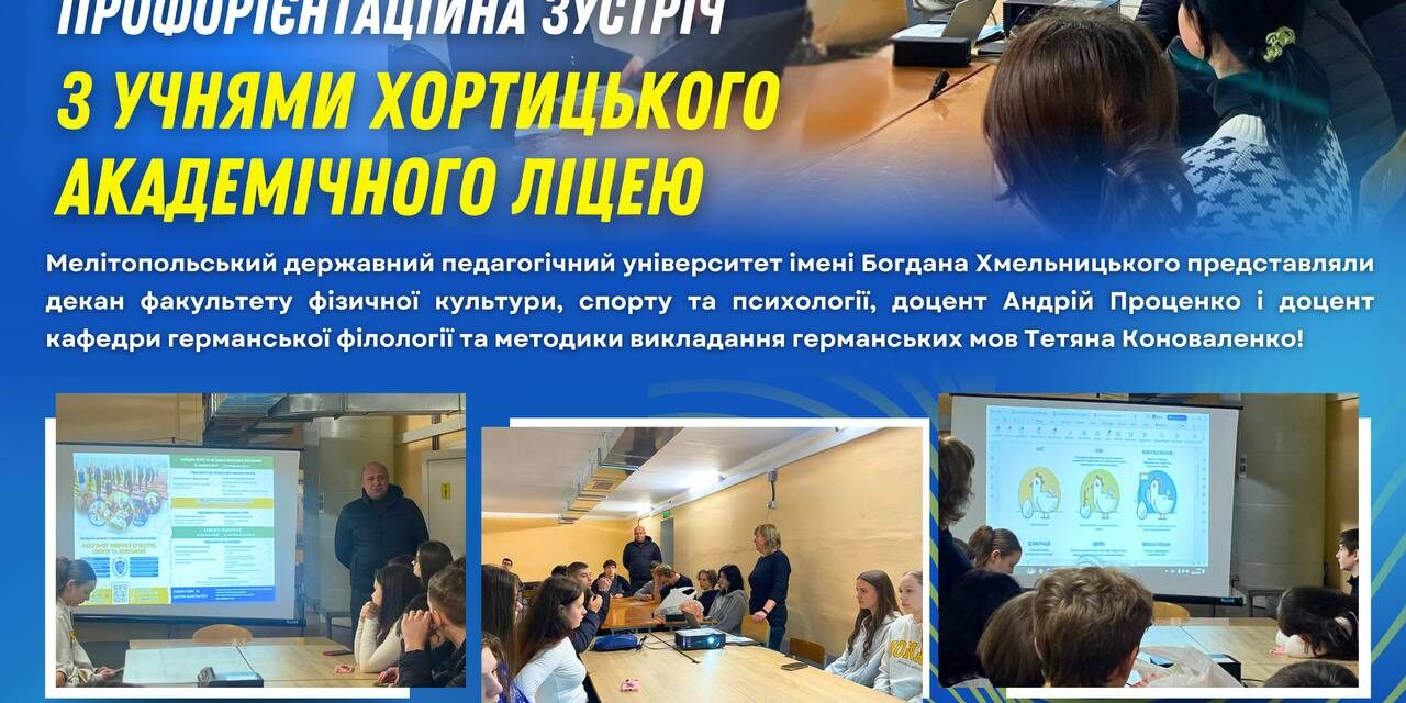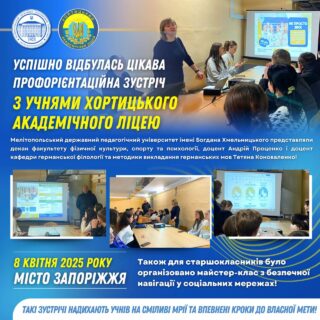 ✅🙋🏻♂️ 8 квітня 2025 року відбулася яскрава та надзвичайно змістовна подія — профорієнтаційна зустріч для учнів Хортицького академічного ліцею, проведена деканом факультету фізичної культури, спорту та психології, доцентом Андрієм Проценком, та доцентом кафедри германської філології та методики викладання германських мов Тетяною Коноваленко.