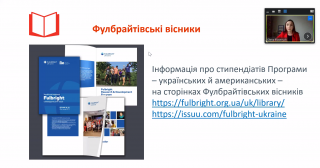 17 березня проведена онлайн-презентація Програми імені Фулбрайт, яку проводили асистентка Іллясевич Олена та випускниця Fulbright Graduate Student Program Дар’я Левченко. На зустрічі були присутні здобувачі вищої освіти, аспіранти, викладачі та гаранти освітніх програм.