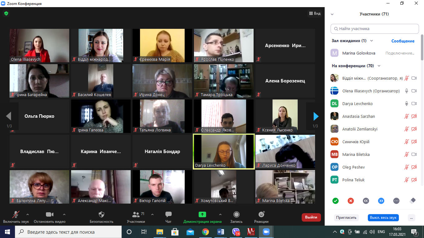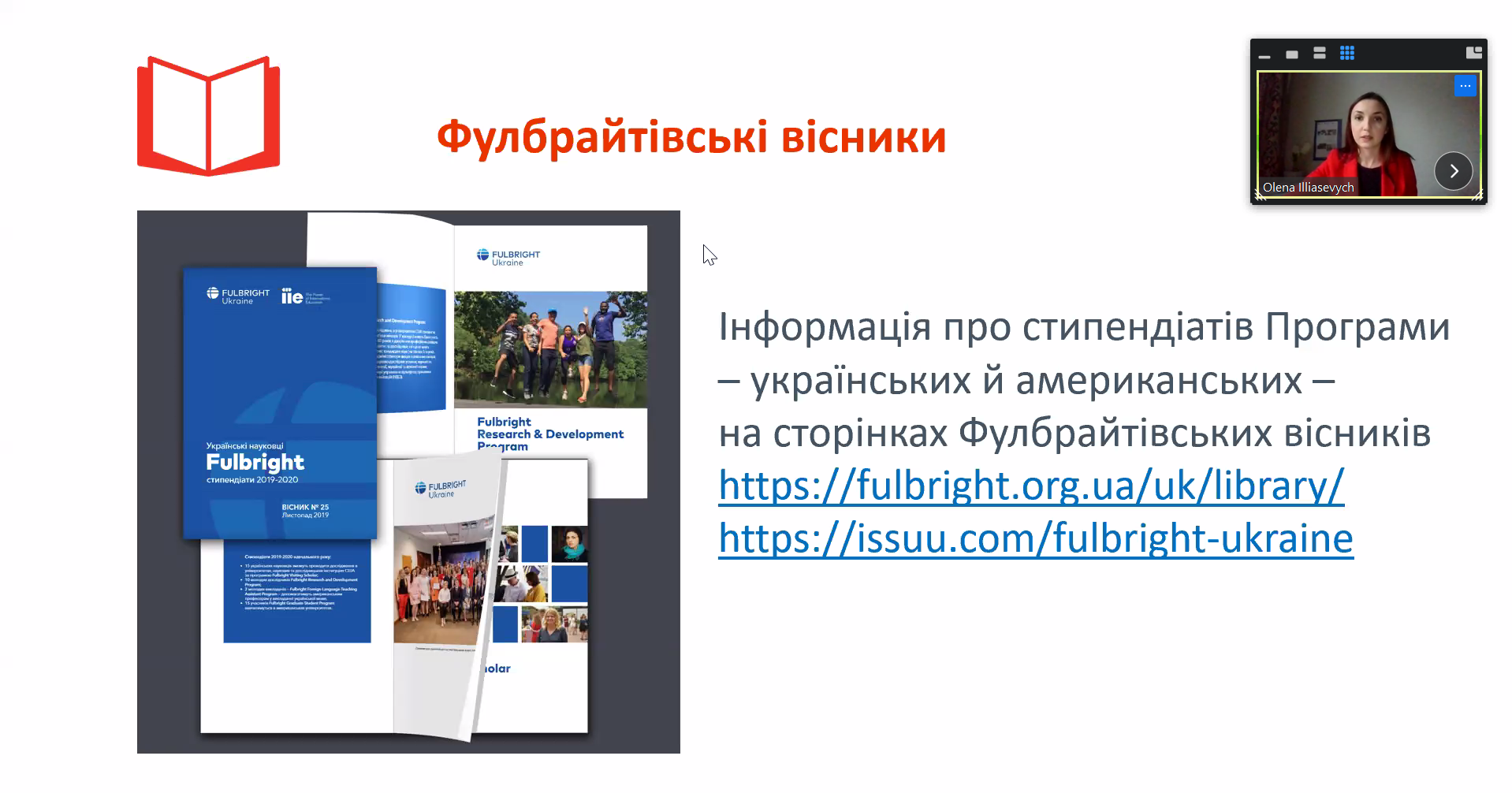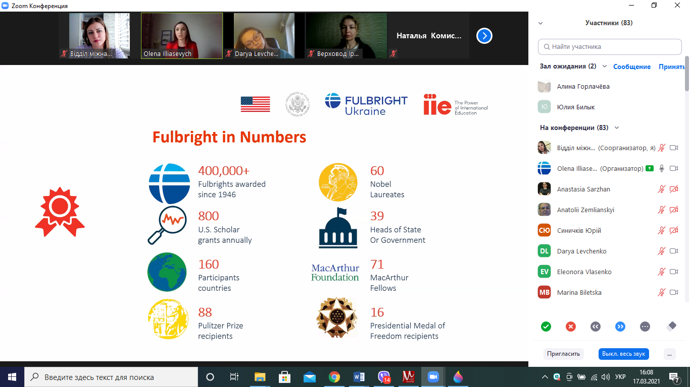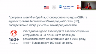 17 березня проведена онлайн-презентація Програми імені Фулбрайт, яку проводили асистентка Іллясевич Олена та випускниця Fulbright Graduate Student Program Дар’я Левченко. На зустрічі були присутні здобувачі вищої освіти, аспіранти, викладачі та гаранти освітніх програм.