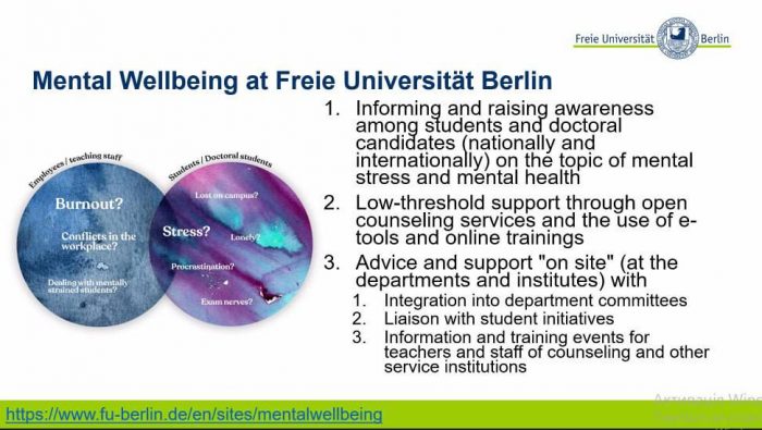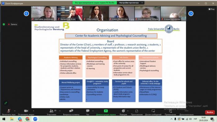 👩🏼💻💫Так, 29 травня 2024 року відбувся черговий вебінар “Psychological support and Mental Wellbeing. Psychological Support Center at FU Berlin” (Психологічна підтримка та психічне благополуччя. Центр психологічної підтримки при Берлінському університеті), який є частиною реалізації третього робочого пакету проєкту “Improvement of the Provided University Psychological Service” (Удосконалення роботи психологічної служби університету).