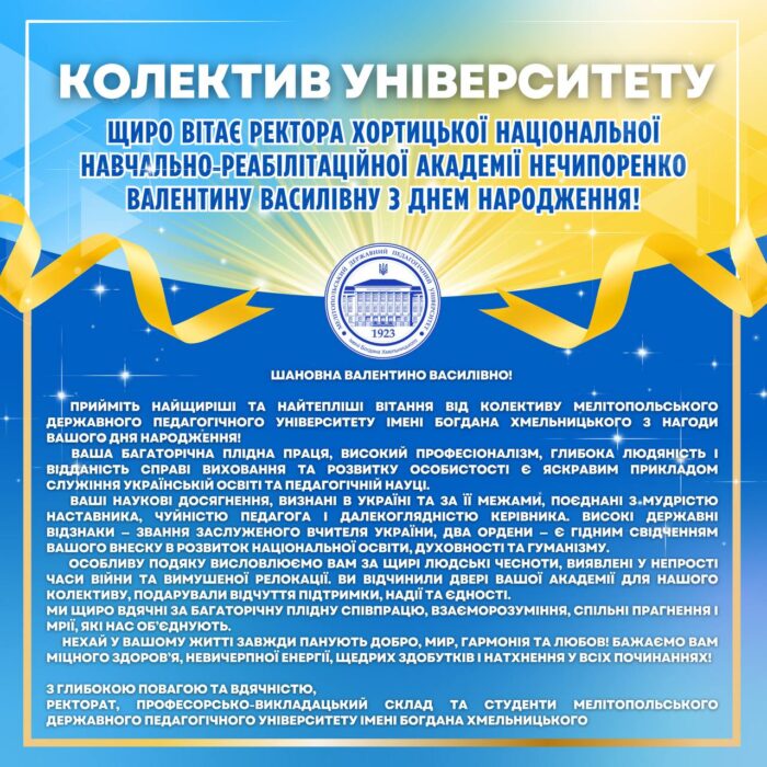 🇺🇦‼️Привітання ректору Хортицької національної навчально-реабілітаційної академії, доктору педагогічних наук, професору Нечипоренко Валентині Василівни з нагоди Дня народження від колективу Мелітопольського державного педагогічного університету імені Богдана Хмельницького!