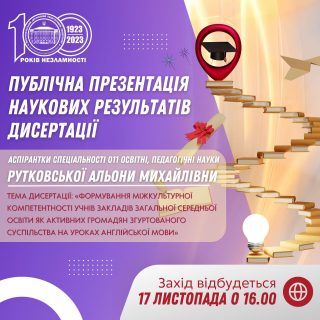 🏛️🎓17 листопада 2023 року о 16.00 відбудеться публічна презентація наукових результатів дисертації аспірантки спеціальності 011 Освітні, педагогічні науки Рутковської Альони Михайлівни.