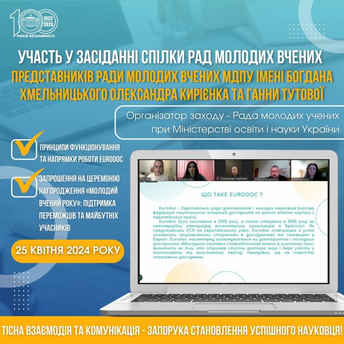 🧑🏻💻⭐️25 квітня 2024 року представники Ради молодий вчених Мелітопольського державного педагогічного університету імені Богдана Хмельницького Олександр Кирієнко та Ганна Тутова взяли участь у засіданні Спілки Рад молодих вчених.