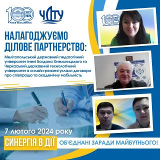 7 лютого 2024 року ректор Мелітопольського державного педагогічного університету імені Богдана Хмельницького Наталя Фалько та ректор Черкаського державного технологічного університету Олег Григор підписали два договори: Договір про співпрацю та Договір про академічну мобільність здобувачів вищої освіти!