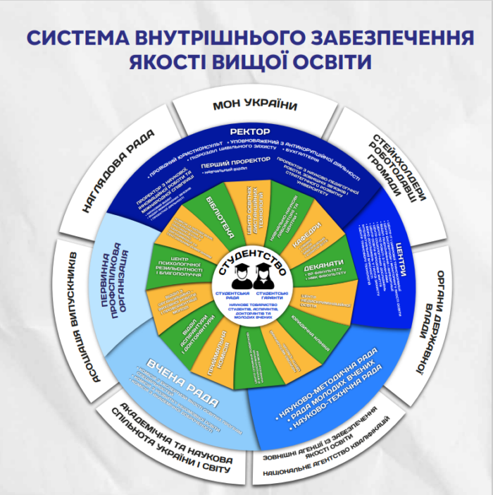 В оновленій Моделі системи внутрішнього забезпечення якості вищої освіти (Рисунок 1.1.) фокус зроблено на студентоцентрованість, урахування Стандартів і рекомендацій щодо забезпечення якості в європейському просторі вищої освіти (ESG). В моделі ураховано взаємозв’язок структурних підрозділів університету та об’єднання здобувачів і стейкхолдерів, які впливають на якість вищої освіти, та зовнішні структури, які формують політику якості на рівнях громади, регіону, держави тощо. Системна взаємодія зазначених складників системи внутрішньої системи забезпечення якості вищої освіти забезпечить стале функціонування культури якості в університеті.