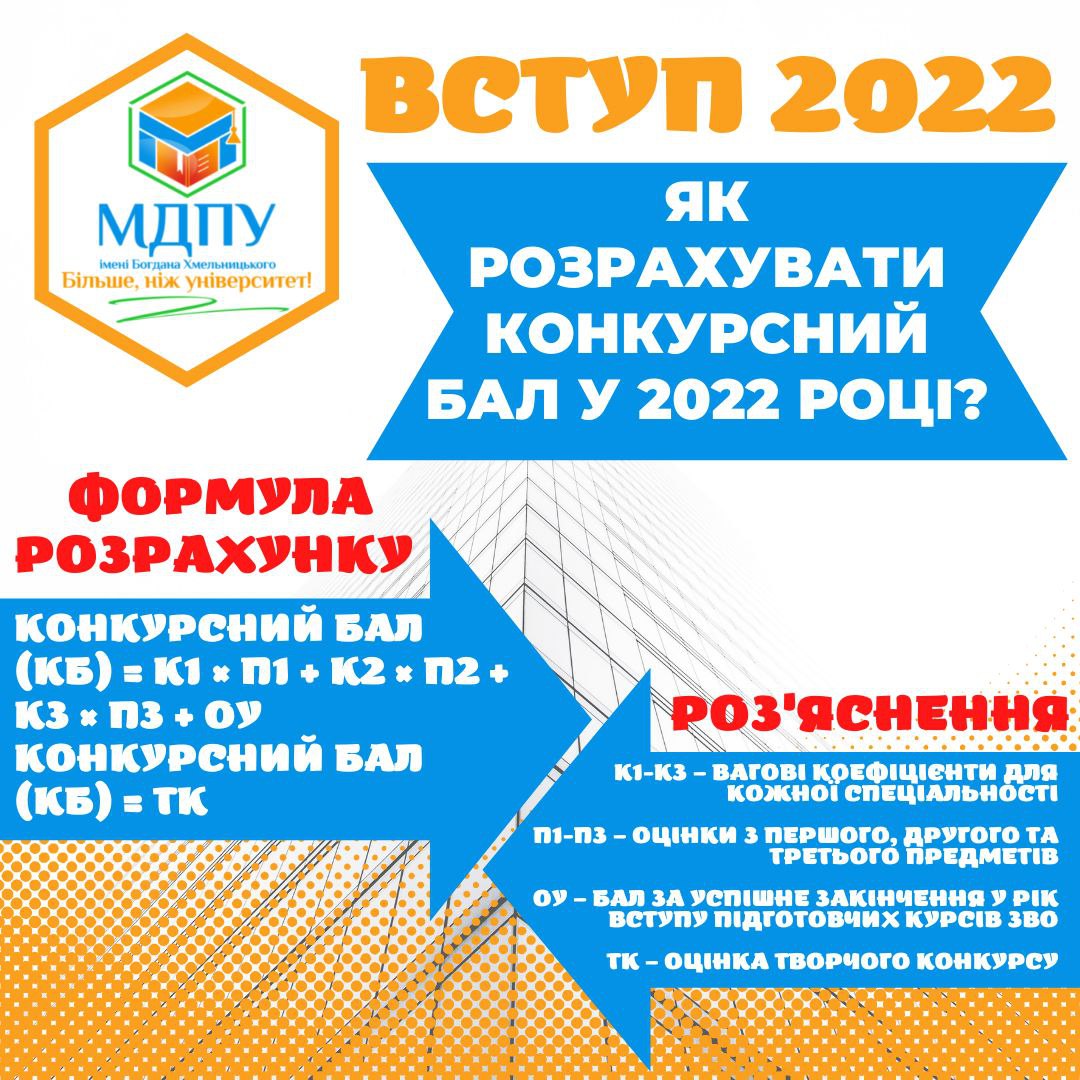 Конкурсний бал – це комплексна оцінка досягнень вступника, до якої входять результати вступних випробувань та інші показники, що обраховуються відповідно до Правил прийому.