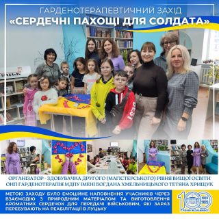 4 лютого 2023 року, в Бібліотеці ДІМ, м. Луцька, здобувачкою другого (магістерського) рівня вищої освіти ОНП Гарденотерапія Мелітопольського державного педагогічного університету імені Богдана Хмельницького Тетяною Хрищук, було проведено гарденотерапевтичний захід “Сердечні пахощі для солдата”.