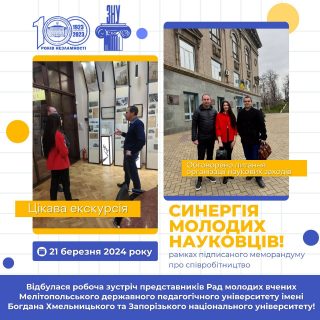 21 березня в рамках підписаного меморандуму про співробітництво відбулася робоча зустріч представників Рад молодих вчених Мелітопольського державного педагогічного університету імені Богдана Хмельницького та Запорізького національного університету.