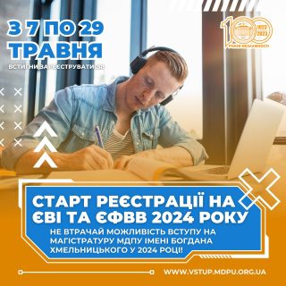 Від сьогодні, 7 травня, з 9:00 до 18:00 29 травня 2024 року Приймальна комісія МДПУ імені Богдана Хмельницького приймає заяви та документи від абітурієнтів для реєстрації вступників для проходження єдиного вступного іспиту та єдиного фахового вступного випробування!