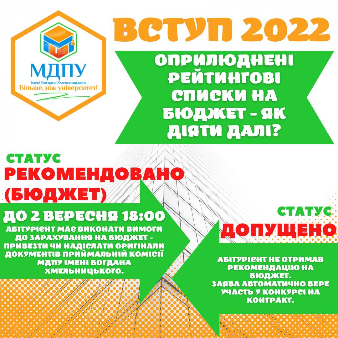 Це означає, що абітурієнт, якого рекомендують, має до 2 вересня 18:00 виконати вимоги до зарахування на бюджет. Тобто привезти чи надіслати оригінали документів приймальній комісії МДПУ імені Богдана Хмельницького на електронну адресу pk-mdpu@ukr.net.