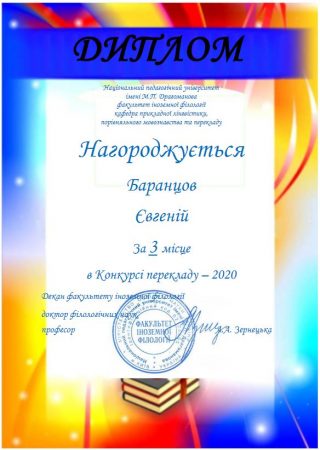 ІІІ місце в першій номінації конкурсу отримав студент І курсу магістратури філологічного факультету Баранцов Євгеній.