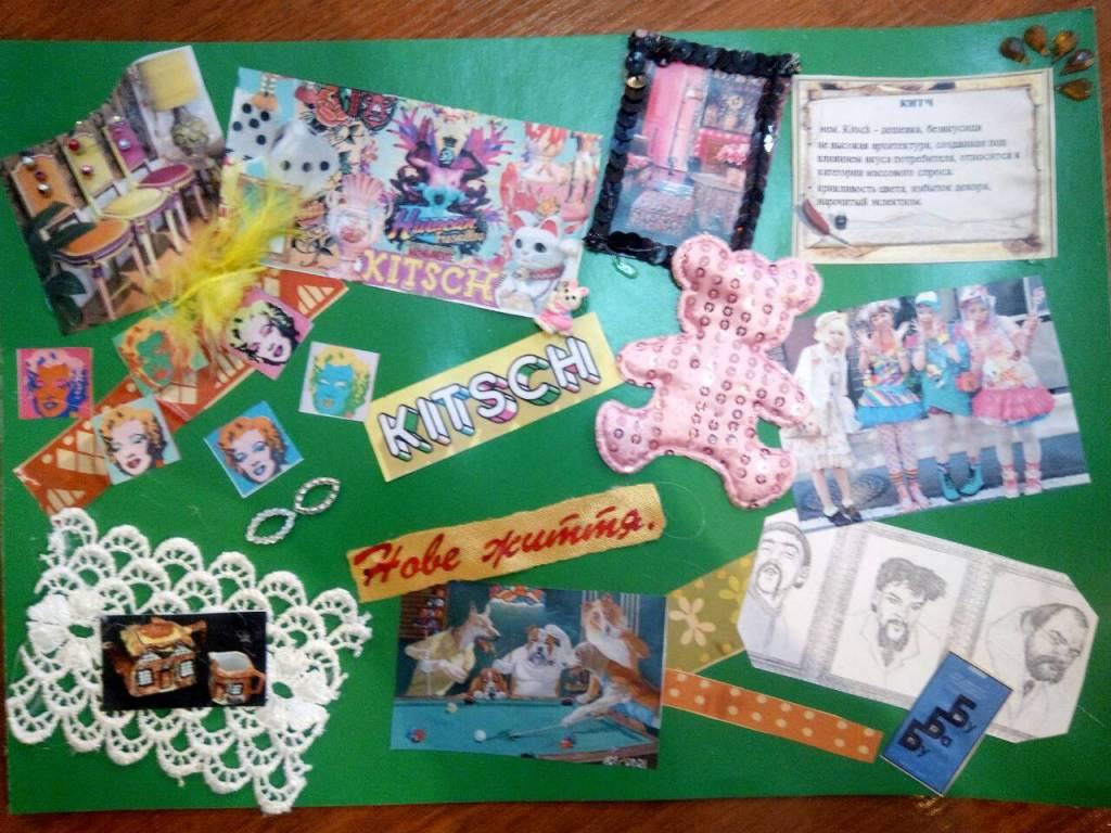Зовсім інше завдання стояло перед студентами І курсу магістратури. Вони передавали на картці суть поняття «Кітч» та його вираження в масовій культурі. На підготовчому етапі студентки мали розглянути особливості цього явища, дібрати приклади його прояву в різних видах мистецтв та зібрати різнорідні матеріали в одній спільній листівці.