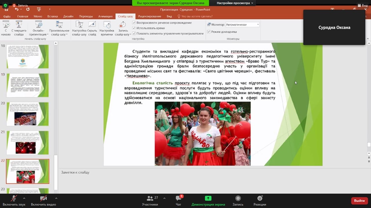 Колектив кафедри економіки та готельно-ресторанного бізнесу щиро вітає студентку спеціальності 051 Економіка Сурядну Оксану та її наукового керівника доцента Верховод Ірину Сергіївну з перемогою у фіналі Всеукраїнського молодіжного конкурсу інноваційних проєктів розвитку туризму на сільських територіях в умовах кризових явищ!