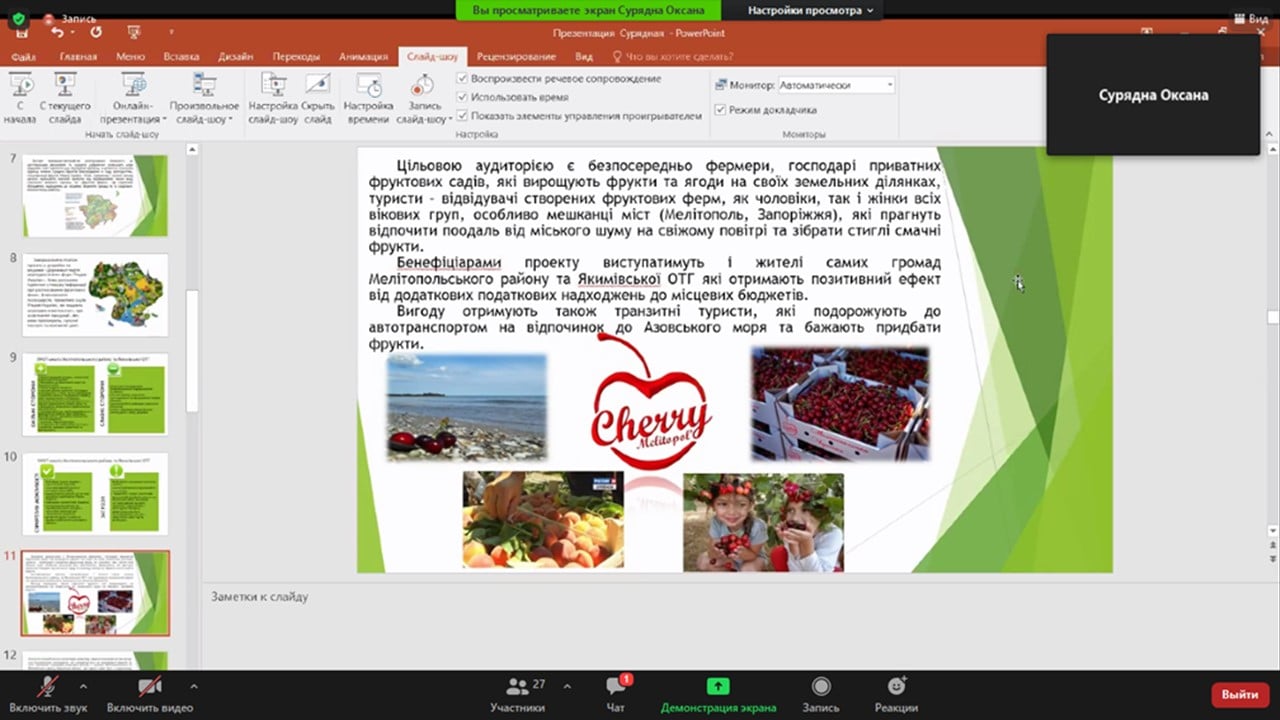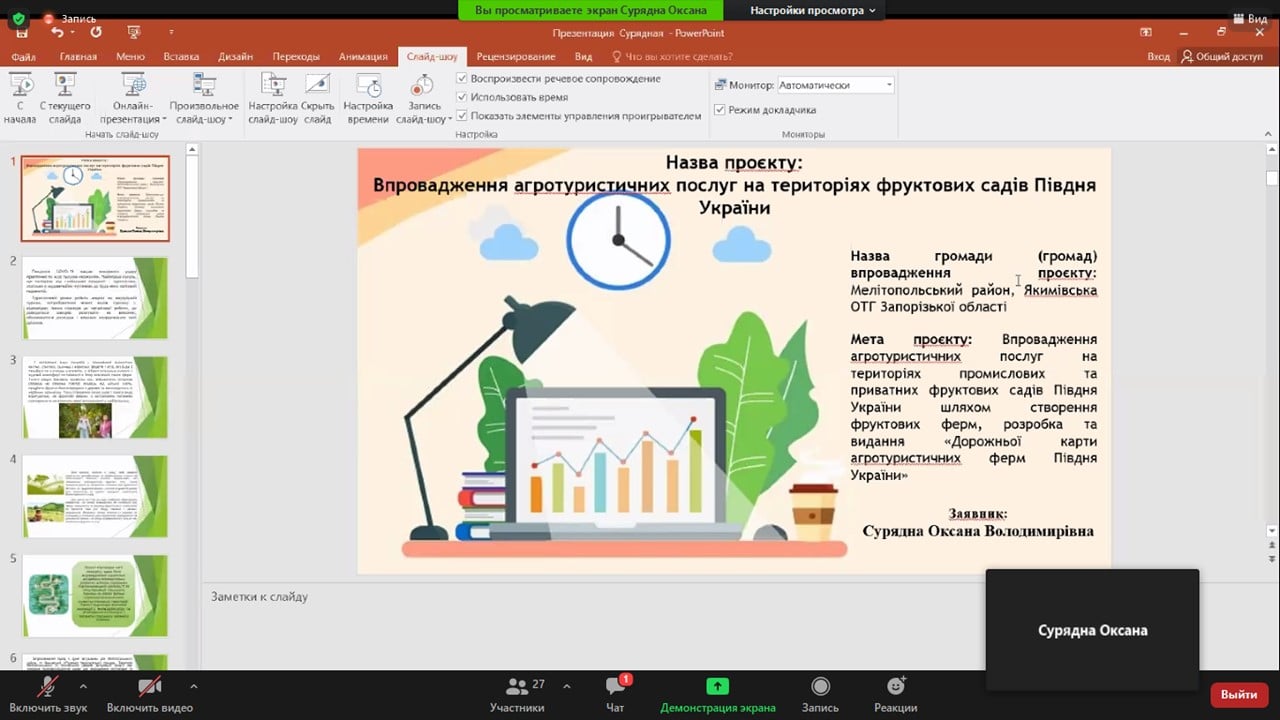 Тема проєкту «Впровадження агротуристичних послуг на територіях фруктових садів Півдня України» (за зайняте 1 місце).
