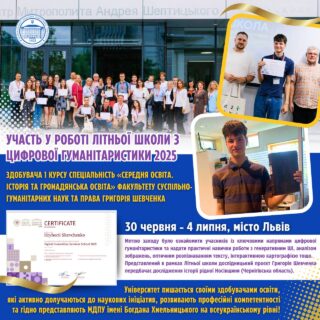📅🦾З 30 червня до 4 липня 2025 року студент 1 курсу Мелітопольського державного педагогічного університету імені Богдана Хмельницького (спеціальність «Середня освіта. Історія та громадянська освіта») Григорій Шевченко взяв участь у роботі Літньої школи з цифрової гуманітаристики 2025 у місті Львові.