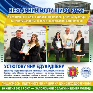 ‼️🥳 Справжнім святом визнання стало вручення подяк Управління молоді, фізичної культури та спорту ЗОДА. Серед нагороджених – яскраві лідери молодіжного руху: Демид Євтушенко, Марія Павленко, Софія Степаненко та, особливо приємно – Яна Устюгова, студентка 4 курсу бакалаврату спеціальності 014.05 Середня освіта (Біологія та здоровʼя людини) МДПУ імені Богдана Хмельницького.