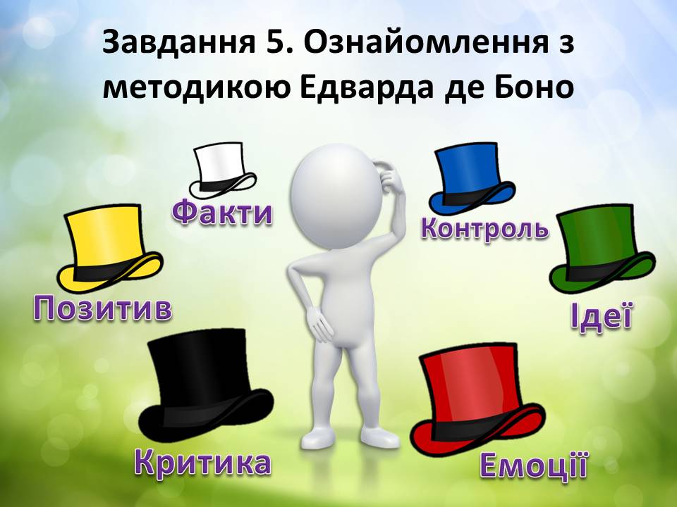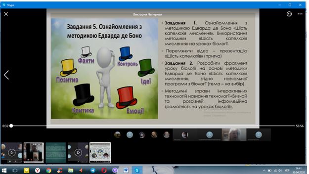 Завдяки практиці «Шість капелюхів мислення», заснованої на ідеї Едварда де Боно «Капелюхи мислення», студенти переглянули відеофільм, презентацію, та занурилися у світ формування креативного та критичного мислення, а саме: досліджували факти, емоції, критику, позитив, креатив та управління. Студенти, які виконували певні ролі, при розгляді біологічних тем по-різному працювали з навчальною інформацією. Кожен капелюх задає певний спосіб мислення – це метод рольової гри. Одягаючи капелюх певного кольору (буквально або подумки), людина грає певну роль, яка їй відповідає, дивиться на себе збоку, а на проблему − з певної точки зору. Студенти за власним бажанням обирали певні кольори, вступали в навчальну гру.
