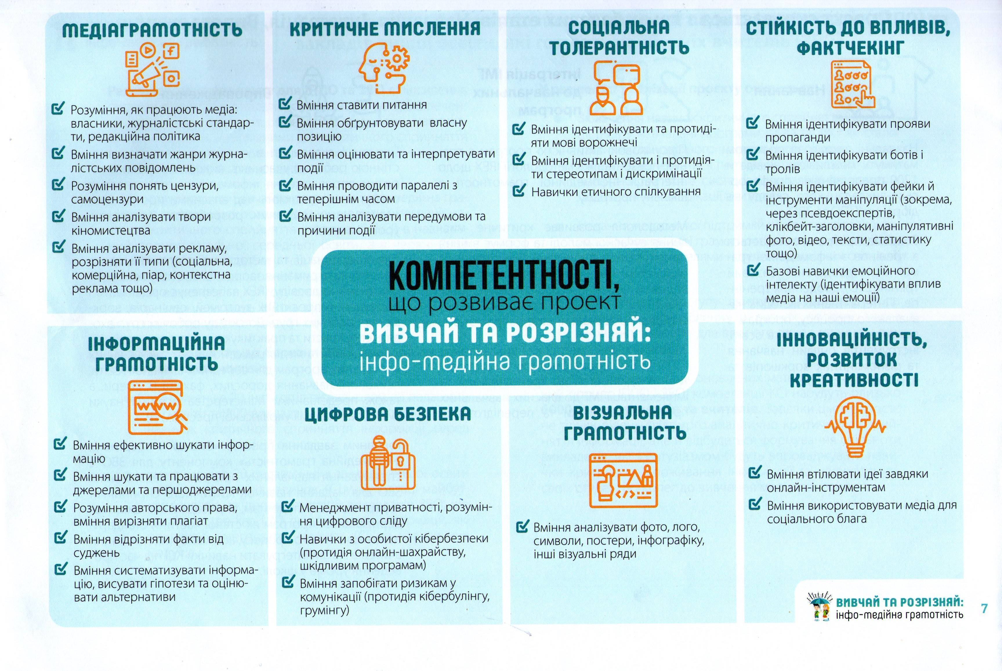 Також студентів також було ознайомлено з компетентностями, що розвиває проект «Вивчай та розрізняй: інфомедійна грамотність», який підтримує міжнародна організація IREX, Міністерство освіти та науки України, Посольство Великої Британії в Україні, Академія української преси, UKAIDfromtheBritishpeople, EmbassyofUnitedStatesKyiv, Ukraine.