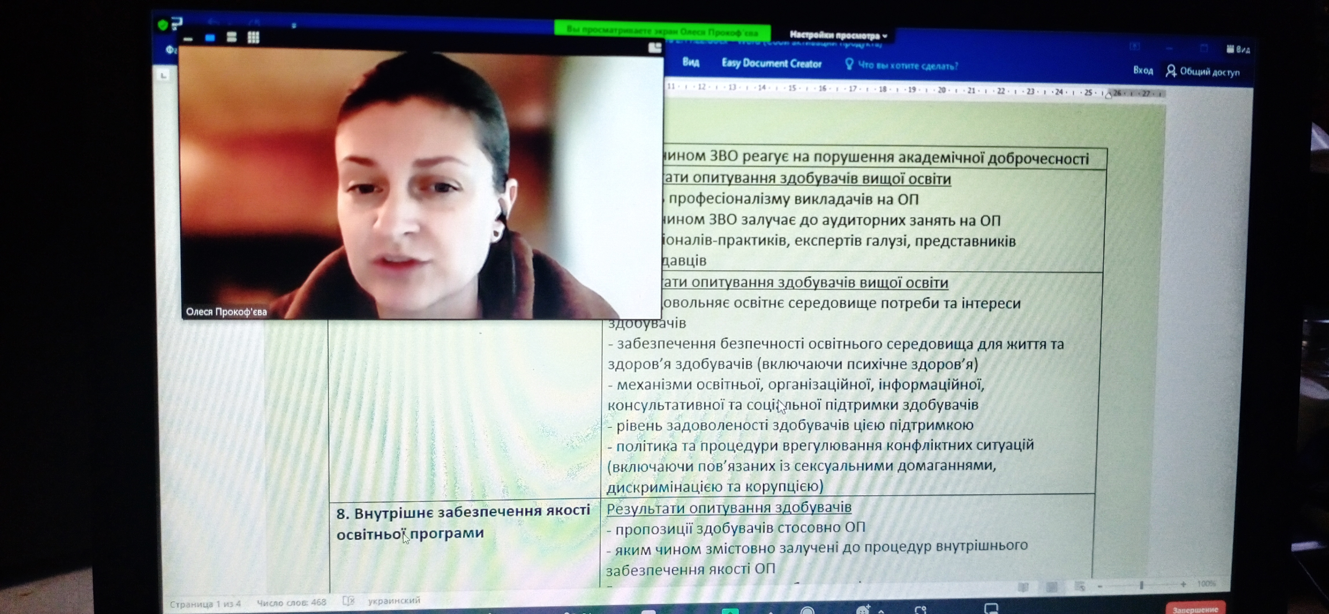 Керівник Центру експертизи та моніторингу якості освітнього процесу кандидат психологічних наук, доцент Прокоф’єва Олеся Олексіївна розповіла “НАВІЩО” потрібне анкетування здобувачів, викладачів, роботодавців, стейкхолдерів щорічно по тім направленням, які задіяні в комплексі щодо якості вищої освіти. Детально розібрали порадник щодо заповнення відомостей самооцінювання освітньої програми (для закладів вищої освіти) затверджено рішенням Національного агентства із забезпечення якості вищої освіти протокол від 29 серпня 2019. №9.