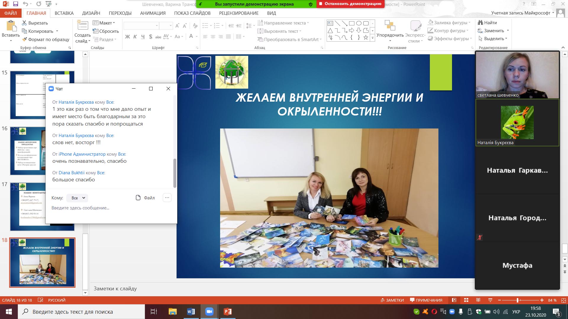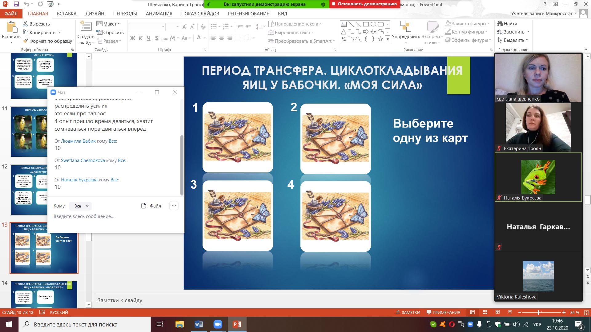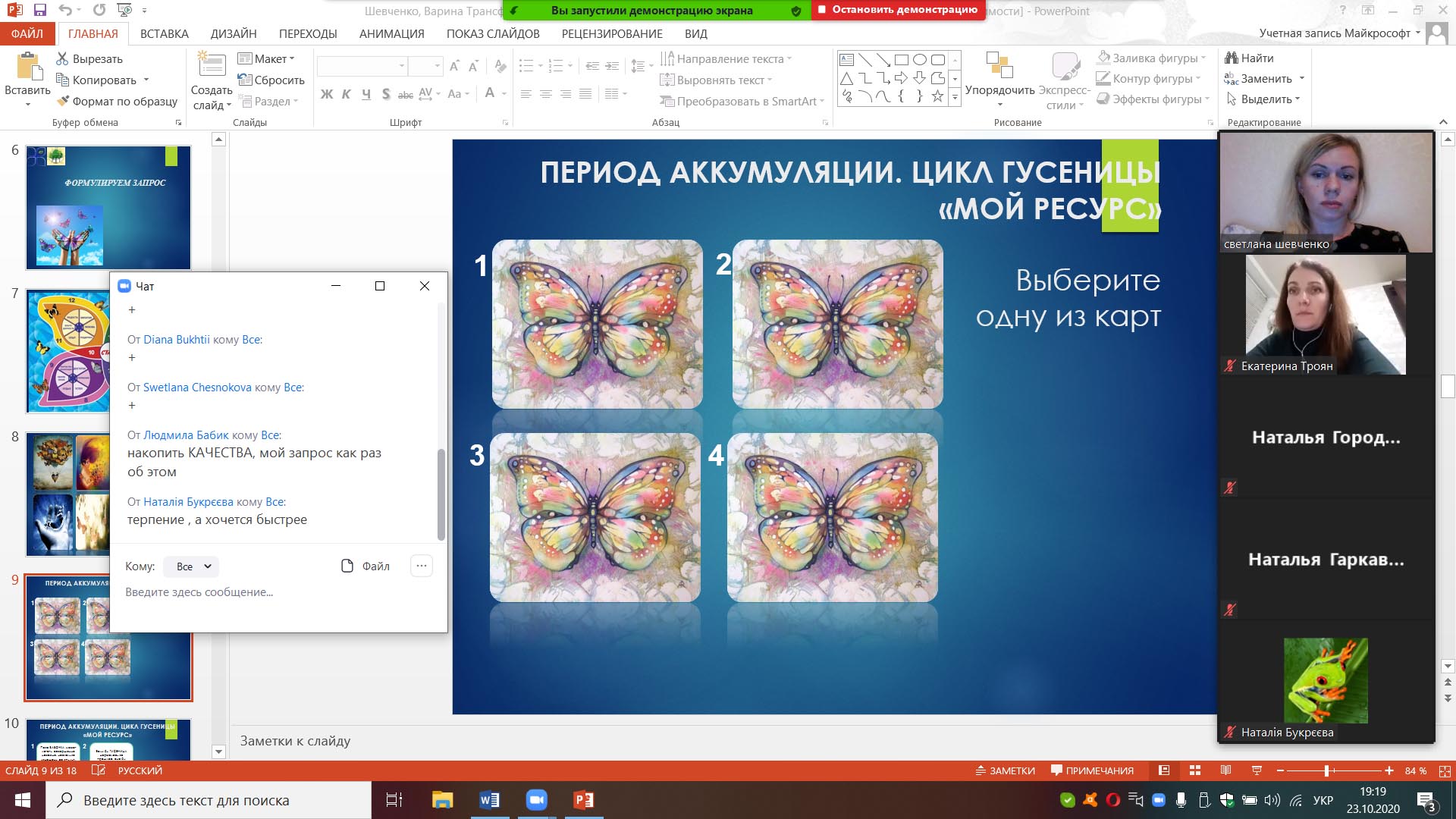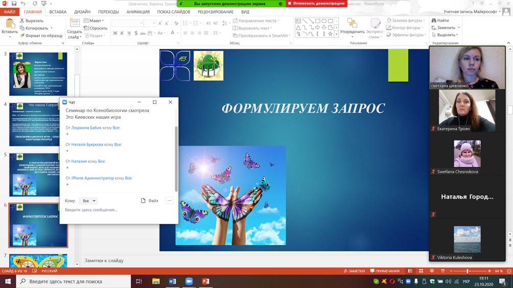 В межах проведення науково-практичного онлайн-курсу «Інноваціні практико-орієнтовані технології психології» 23.10.2020 року для слухачів курсу була проведена трансформаційна психологічна гра «Розправ крила». Авторами та ведучими гри є викладачі кафедри психології Шевченко С.В. та Варіна Г.Б.