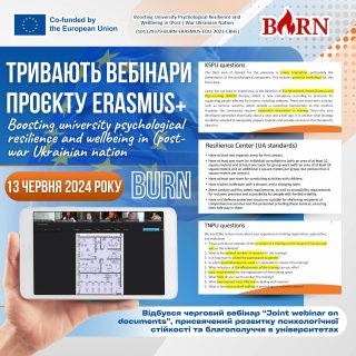 🎓✅Тривають вебінари проєкту ERASMUS+ “Boosting university psychological resilience and wellbeing in (post-war Ukrainian nation” – BURN (Посилення психологічної стійкості і благополуччя університетів у (після)воєнній Україні), в якому бере участь наш університет!