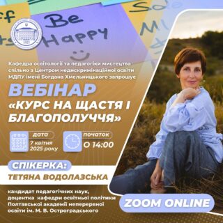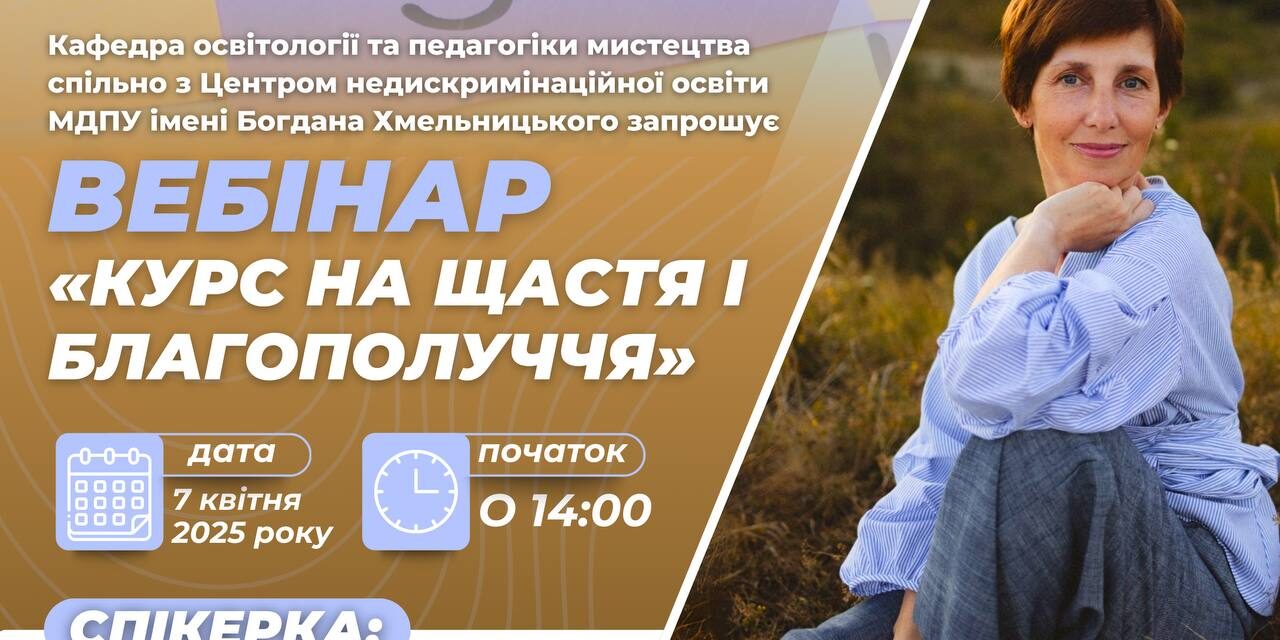 🎓💫 Кафедра освітології та педагогіки мистецтва та Центр недискримінаційної освіти МДПУ імені Богдана Хмельницького запрошує долучитись до вебінару: «КУРС НА ЩАСТЯ І БЛАГОПОЛУЧЧЯ».