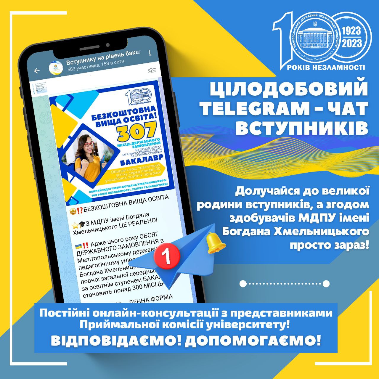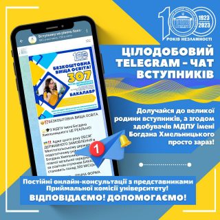 Для зручного спілкування та швидкого реагування на усі запитання вступників, створений та активно працює Telegram – чат, де ви можете залишити своє запитання, а фахівці приймальної комісії нададуть чіткі відповіді та у подальшому будуть вашими головними наставниками в період вступної кампанії 2023 року!