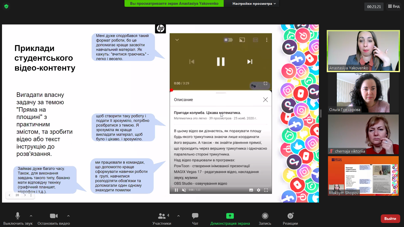 18 березня Анастасія Яковенко провела воркшоп «Блоґґінґ як мотиваційний тріґґер залучення студентів у процес навчання» та розкрила можливості використання мобільного застосунку InShot для створення короткого відео для власного блоґу з навчальною метою. Цей формат роботи представлено як універсальний спосіб формування різних фахових компетентностей студентів та мотиваційний тріґґер підвищення ефективності сучасного освітнього процесу.