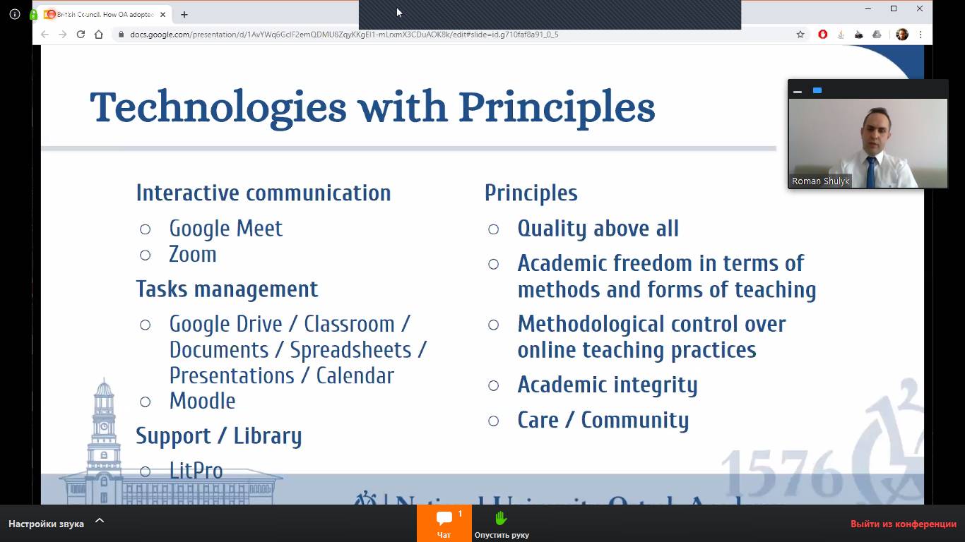 7 травня 2020 р. викладачі університету Т.В. Коноваленко і А.С. Яковенко взяли участь у вебінарі «How ready are universities to use emerging technologies?», організованому головним офісом Британської Ради в Лондоні. Цей вебінар є частиною #StayHome with the British Council програми, у межах якої пройде серія діалогів між університетами Об’єднаного Королівства та країн Східної Європи для обміну досвідом роботи закладів вищої освіти в умовах карантину через Covid-19.