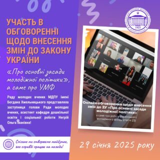 💫👩🏼🎓 29 січня 2025 року Заступниця голови Ради молодих вчених, асистент кафедри дошкільної освіти і соціальної роботи Негрій Ольга Іванівна доєдналася до Обговорення щодо внесення змін до ЗУ «Про основні засади молодіжної політики», а саме про УМФ .