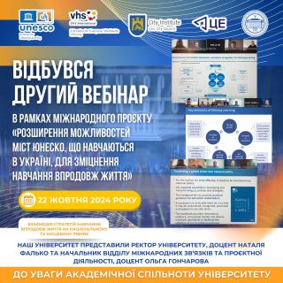 22 жовтня 2024 року ректор нашого університету Наталя Фалько та начальник відділу міжнародних зв’язків та проєктної діяльності відвідали другий вебінар в рамках Міжнародного проєкту «Розширення можливостей міст ЮНЕСКО, що навчаються в Україні, для зміцнення навчання впродовж життя».